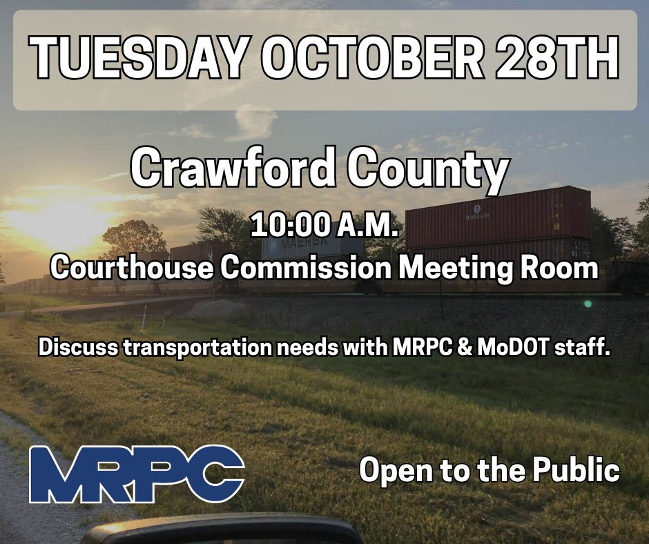 ST. JAMES—Meramec Regional Planning Commission (MRPC) Executive Director Bonnie Prigge, Planning Manager Anne Freand and Missouri Department of Transportation (MoDOT) Meramec Area Engineer Preston Kramer will meet with Crawford County commissioners and citizens to discuss transportation needs on the state system Oct. 28, 2025, at the Courthouse Commission meeting room, 111 Third St., Steelville. The meeting will start at 10 a.m.