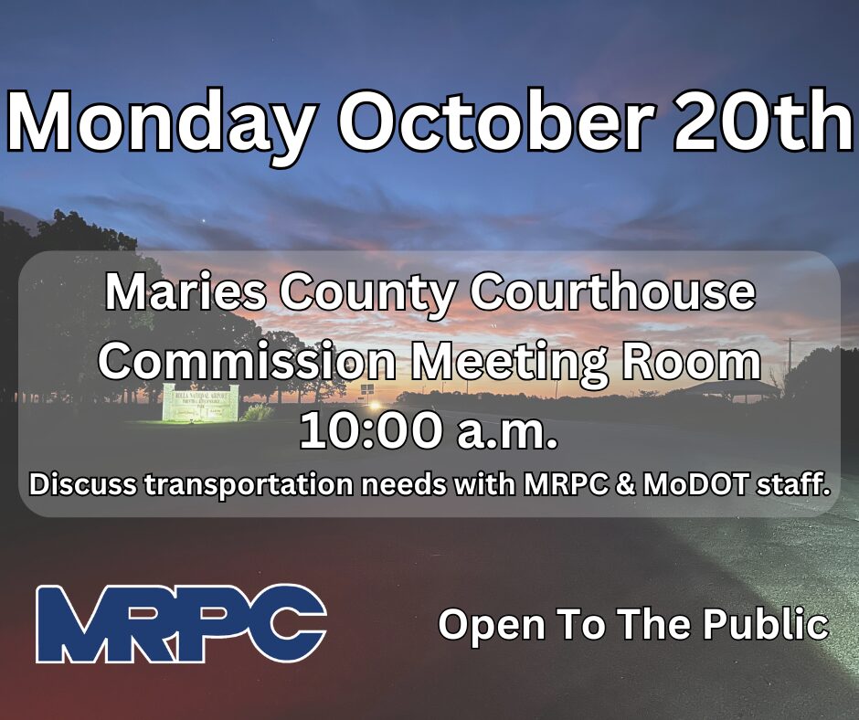 ST. JAMES—Meramec Regional Planning Commission (MRPC) Executive Director Bonnie Prigge, Planning Manager Anne Freand and Missouri Department of Transportation (MoDOT) Meramec Area Engineer Preston Kramer will meet with Maries County commissioners and citizens to discuss transportation needs on the state system Oct. 20, 2025, at the Courthouse Commission meeting room, 211 4th St., Vienna. The meeting will start at 10:00 a.m.
